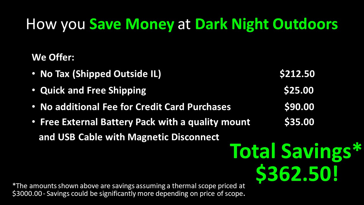 MSRP: $1,199.00For a Limited Time $1,099.00Welcome to Dark Night Outdoors, your premier online store for high-quality thermal optics and accessories. As a leading thermal scopes and thermal optics store, we specialize in night vision and thermal imaging solutions for hunting, law enforcement, and tactical use. Our wide selection includes top brands of thermal scopes, scanners (monocular), binoculars, clip-ons and infrared illuminators, and other accessories and parts to enhance your visibility and accuracy in low light conditions. Thermal scopes differ from night vision, which amplifies ambient light levels; thermal optics are instead sensitive to infrared radiation, which means they can “see” gradients of heat in complete darkness. Explore thermal products, along with other tactical, hunting and shooting accessories. With years of experience providing thermal imaging products to civilian, law enforcement, and military clients, Dark Night Outdoors has the knowledge and inventory to equip you for tactical operations, surveillance, or your next predator of hog hunting trip under the cover of darkness. Contact us today to find the ideal night vision or thermal optics to fit your needs and budget.