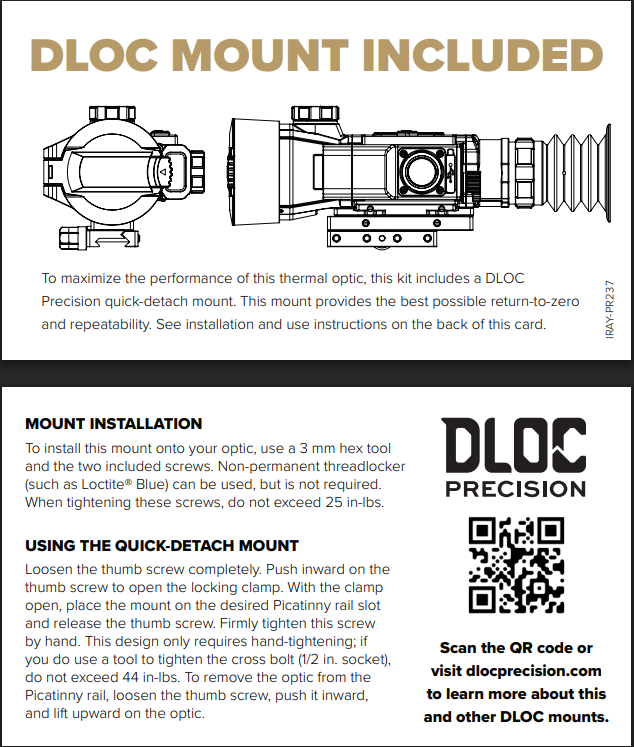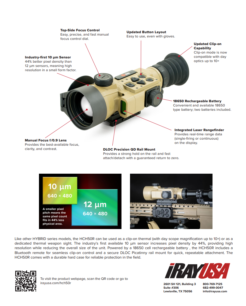 Like other HYBRID series models, the HCH50R can be used as a clip-on thermal (with day scope magnification up to 10×) or as a dedicated thermal weapon sight. The industry’s first available 10 µm sensor increases pixel density by 44%, providing high resolution while reducing the overall size of the unit. Powered by a 18650 cell rechargeable battery , the HCH50R includes a Bluetooth remote for seamless clip-on control and a secure DLOC Picatinny rail mount for quick, repeatable attachment. The HCH50R comes with a durable hard case for reliable protection in the field.