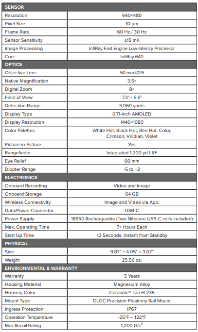 The Hybrid Compact (HCH50R) is the next evolution of the HYBRID series, combining advanced thermal performance with versatile functionality. It features a 50 mm F/0.9 lens and the industry’s first available 10 µm thermal sensor. The 640×480 InfiRay sensor with a ≤15 mK NETD rating delivers exceptional thermal sensitivity and clarity. The Hybrid Compact functions as a weapon sight, thermal clip-on, or handheld monocular. Its 3.5x native magnification and 60 mm eye relief provide a comfortable, immersive view. The “Fast Engine” low-latency architecture (15 ms) and 60 Hz refresh rate ensure a smooth, life-like image, improving target tracking and accuracy. A 1440×1080 AMOLED display provides a crisp image, while the integrated laser rangefinder and ballistic calculator adjust for drop based on target distance. Built-in photo and